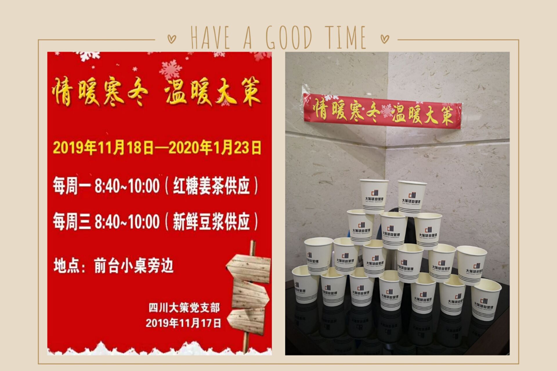歲暮陰陽催短景,天涯霜雪霽寒宵。將臨冬至,天氣日漸嚴寒。大策公司為大家準備了生姜紅糖水與新鮮豆漿。