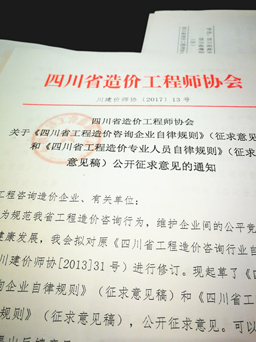 四川省造價工程師協(xié)會關(guān)于《四川省工程造價咨詢企業(yè)自律規(guī)則》(征求意見)和《四川省工程造價專業(yè)人員自律規(guī)則》(征求意見稿)公開征求意見的通知